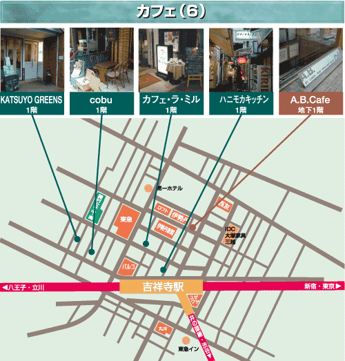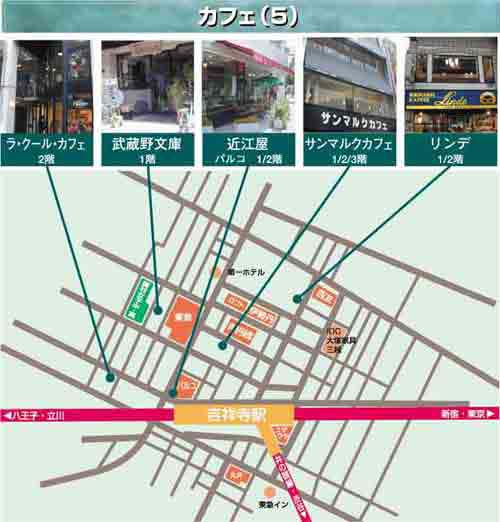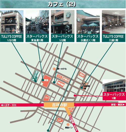 ●タリーズコーヒー 2001年3月に東急裏エリアにオープンしたが ●スターバックス おしゃれな雰囲気とコーヒーなどのバリエーションが多い。吉祥寺に5店舗、4店目は2002/1月にOPEN。駅に一番近い店舗は6:30から。タバコは外の席。●東急デパートの真裏のお店は晴れた日にはお勧め。外のベンチは犬の散歩の途中と見られる人がにいる。タバコも。●伊勢丹と東急デパートとの間は、2階の窓際がいい。トイレが広くて気持ちいいが本当のお勧めは隠れた地下です。イベントもある。4店目の新生銀行となり。 |