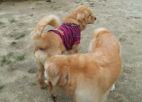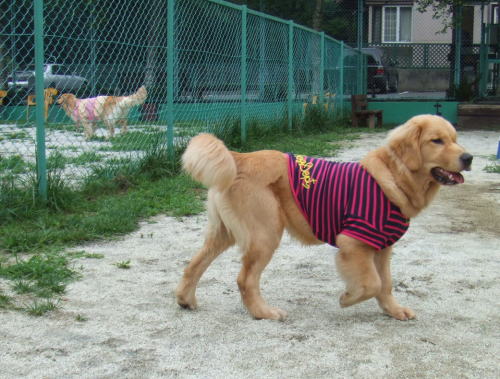 タバ姉ちゃんはここでーす!同じドッグランに入ってもちょっと隔離状態のお嬢様は、大漁苑状態でご挨拶だったよ。 それにしても凄いでしょ、このドッグラン。 ゴルばっかりこんなに集合しててさー。 写真は左から、うめ吉さん、タバサちゃん、ブルース君、ティファニーちゃん、オレンジの胴体だけ見えてるのがロジャー君、右端にブルーのお洋服着てるのがカル姐さん、手前でボール咥えてるのがオハナちゃん。。。 その場に居た人だけが識別できるのさ。笑。 あれ、ブルース君とティファニーちゃんがキスしてるみたいに見えない? |