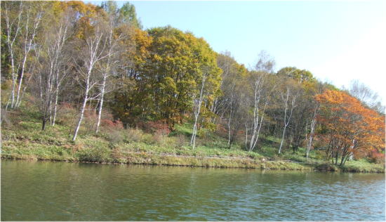 湖沿いの林の中の散歩道は、 枯葉に覆われて秋らしい景色で とっても清々しかったよ。 あ、上のお写真、 僕の後ろの小さな池は、 エサ釣り用の池ね。 そしてこっちのお写真の僕の横が、 湖に流れ込む小川ちゃんだよ。 |
