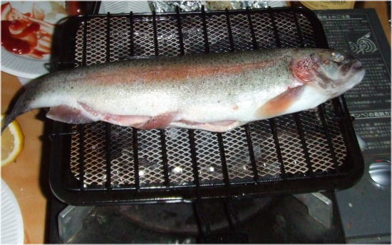そして、 待ってました!夕食の時間だよ〜! プリースト(牧師)に殴り殺されたニジマスちゃんが、 カセットコンロの上で焼けているよ。 そうだよ、ロビン家はね、 炭火でバーベキューなんて高級なことは やらないんだよ。 家で使ってる カセットコンロを持っていって使っちゃうのさ。 お手軽キャンプもいいとこだよね。笑。 |