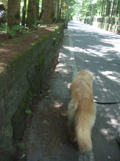 無事朝ごはんも終わったので、ちょっくらお散歩にでることになったよ。 ここは風が涼しいし、木陰が沢山あるから暑い日に歩くのに向いているみたいだ。 そうそう、この日の軽井沢は珍しく30度という暑さだったんだよね。 東京の熱気から逃げてきたはずだったのに、あんまり変わらない気温にはがっかりだったよ。 でも、湿度は東京より低いよね。 木陰は気持ちよかったもん。 |