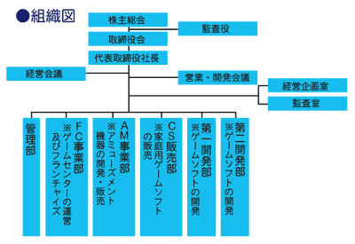 | 事業内容 | 家庭用・業務用ゲームソフトの企画・開発・販売・輸出入 アミューズメント機器の企画・開発・販売 アミューズメント施設の企画・運営・FC事業 |